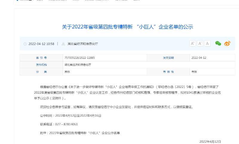 4月12日,湖北省經(jīng)濟和信息化廳官網(wǎng)上公示了入圍2022年省級第四批專精特新“小巨人”企業(yè)名單,湖北薈煌科技股份有限公司經(jīng)過前期申報及專家組審核,順利通過,成功入圍。